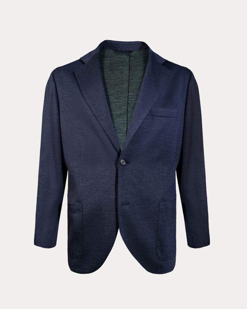 Revolutionary knitted wool jersey construction redefines summer tailoring. This deconstructed blazer moves like athletic wear while maintaining executive presence. Italian ultra-luxury fabric breathes with unprecedented comfort while natural material composition—wool, silk, linen—ensures climate adaptability. The unstructured silhouette liberates movement without sacrificing sophistication. Perfect for leaders who refuse to choose between performance and prestige.